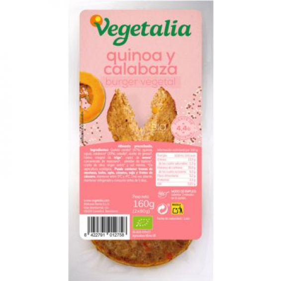 Vegeburger de Quinoa y Calabaza Bio de Vegetalia es una hamburguesa vegetal con un 47% quinoa en grano y un 20% calabaza. Una alternativa vegetal llena de sabor li sta para servir, vuelta y vuelta a la sartén con una gotita de aceite. Te hará disfrutar del sabor gracias a su combinación de ingredientes!