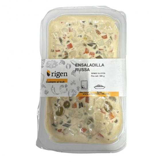 Ensaladilla Rusa 300gr Origen, es un plato preparado considerado como la reina de las tapas y los entrantes. Tiene las verduritas típicas cocidas al vacío más aceitunas, atún, huevo y mayonesa. Debido a su cocción a baja temperatura conserva todo su sabor.