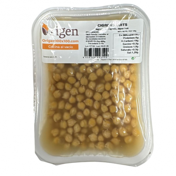 Garbanzo Pequeño Cocido 350gr Origen, es un plato preparado de garbanzos cocidos al vacío con sal. Origen consigue gustos y texturas idénticas a una buena cocción tradicional . Puedes escurrir o aprovechar el jugo de su cocción para hacer guisos de manera muy rápida.