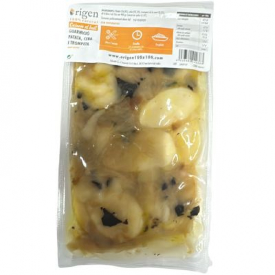 Patata con Cebolla y Trompeta 400gr Origen, es una combinación de patata, cebolla y trompetas de la muerte horneadas y cocidas al vacío. Las puedes utilizar directamente como acompañamiento o utilizarlas como cama para cocer alguna pieza de carne o pescado al horno.