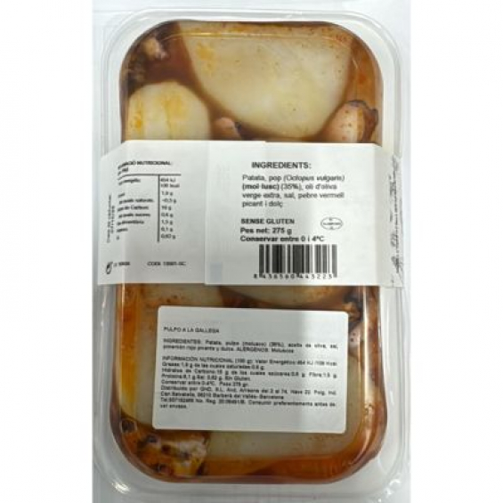 Patata, pulpo (molusco) (29%), aceite de oliva, sal, pimentón rojo picante y dulce.