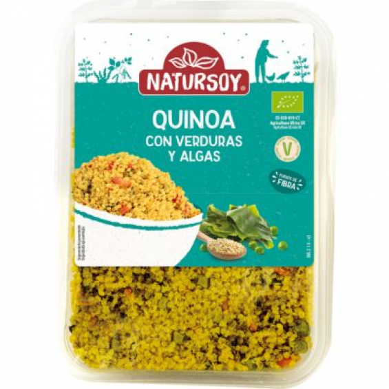 Quinoa con Verduras y Algas 300gr Natursoy. Es un plato preparado de quinoa con verduras y algas nori listo para servir de ingredientes ecológicos. Esta comida vegana es rica en fibra, proteínas vegetales y omega 6 y las algas nori le otorgan propiedades antioxidantes y depurativas, al ser un plato tan saludable como sabroso es ideal para incluir en tu dieta vegetariana.