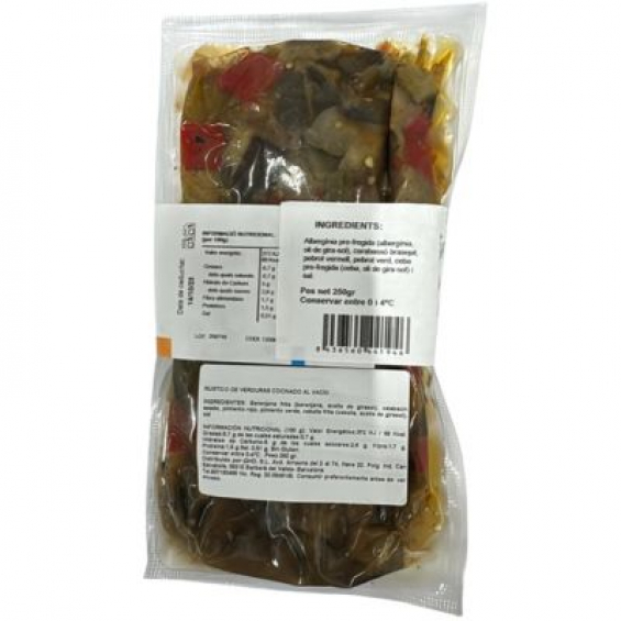 Rústico de verduras al vacío 250gr Origen. Rústico de verduras al vacío , berenjena y cebolla fritas, calabacín asado y pimientos rojo y verde en cubos, cocidas a baja temperatura para conservar todo su sabor. El método de envasado al vacío permite mantener el sabor y las propiedades nutricionales de los alimentos. Puedes consumir este plato preparado como acompañamiento de otras comidas o como ingrediente en la elaboración de recetas.